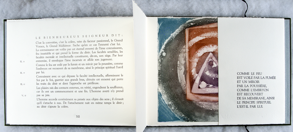 Comme le feu est voilé par la fumée et un miroir par la poussière, comme l'embryon est recouvert de sa membrane, ainsi le principe spirituel l'est-il par lui. III,36-39