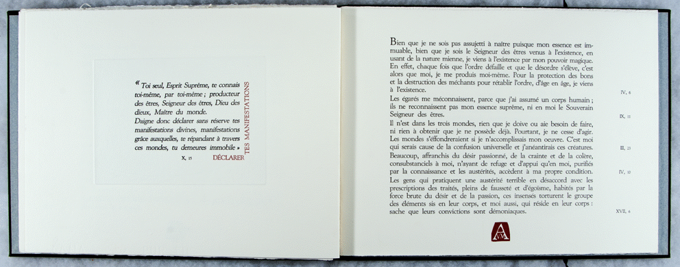 "Tu es le Dieu primordial, l'Esprit; tu es l'Ancien, le Réceptacle suprême de cet univers. Tu es le Sujet connaissant, l'Objet à connaître et le Séjour suprême. C'est Toi, aux formes infinies, qui déploies l'univers" XI,38