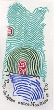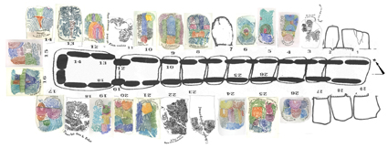Sur les 26 dalles gravées de Gavrinis il a tenté ces 18 eaux-fortes polychromes sur cuivre en s'aidant des relevés que fit, dans les années quatre-vingts, l'archéologue irlandaise de l'Université de Cork, le Professeur Elizabeth Twohig : qu'elle reçoive ici l'hommage de notre gratitude!