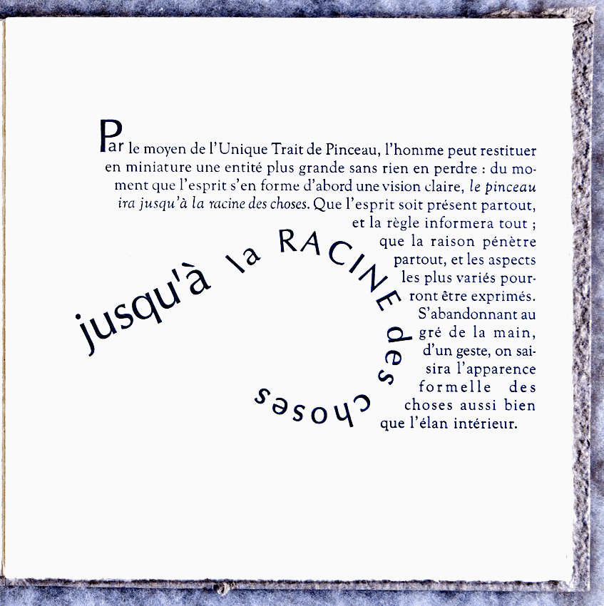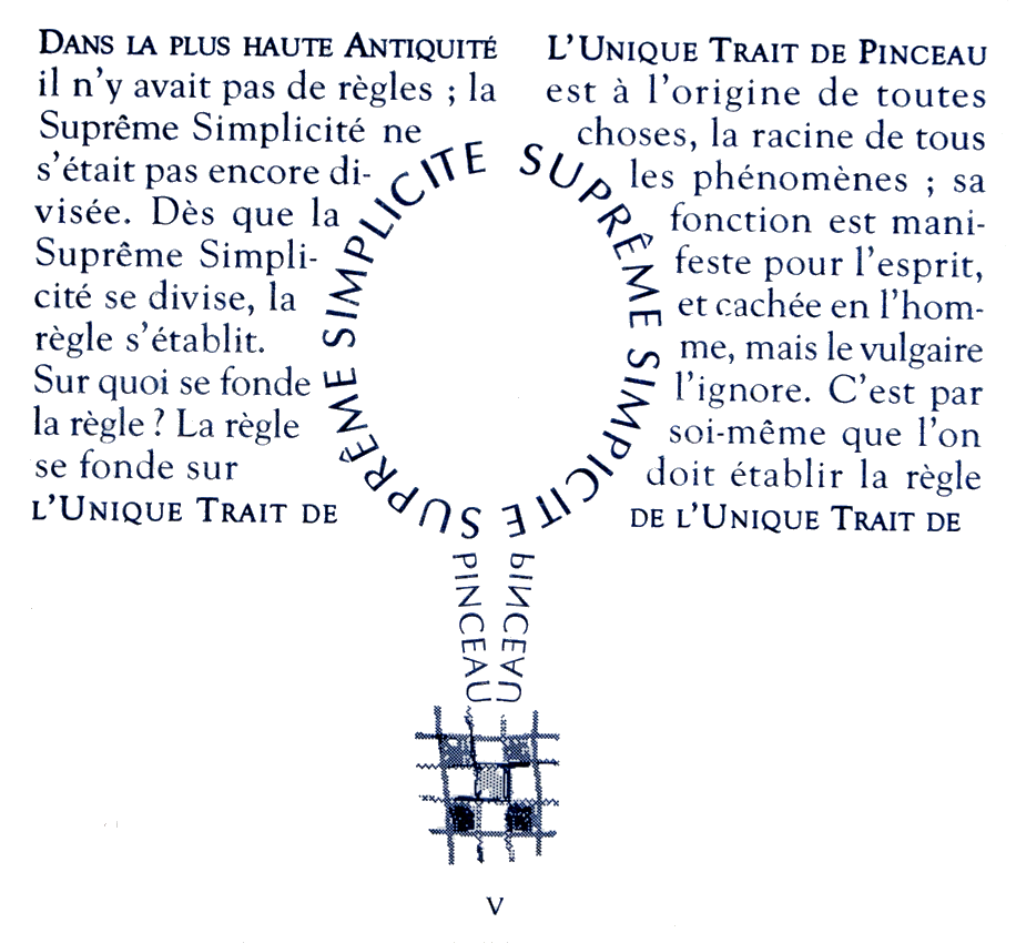 Par le moyen de l' Unique Trait de Pinceau, l' homme peut restituer en miniature une entité plus grande sans rien en perdre : du moment que l' esprit s' en forme d' abord une vision claire, le pinceau ira jusqu' à la racine des choses. Que l' esprit soit présent partout, et la règle informera tout ; que la raison pénètre partout, et les aspects les plus variés pourront être exprimés. S' abandonnant au gré de la main, d' un geste, on saisira l' apparence formelle des choses aussi bien que l' élan intérieur.