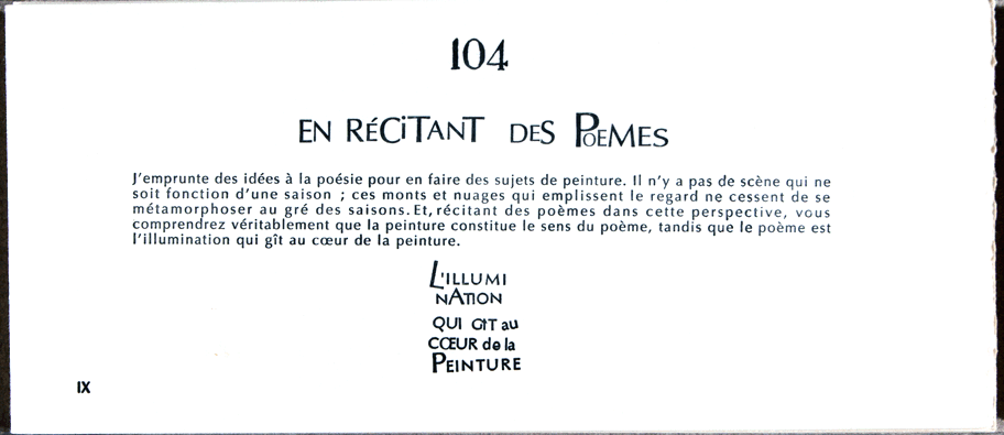 Au milieu de l'océan de l'encre, il faut établir fermement l'esprit ; à la pointe du pinceau, que s'affirme et surgisse la vie ; à partir de l'Un, l'innombrable se divise ; à partir de l'innombrable l'Un se conquiert. La métamorphose de l'Un produit Yin et Yang et voilà que toutes les virtualités du monde se trouvent accomplies.J'accouche de ma création, ce n'est pas elle qui pourrait accoucher d'elle-même.
